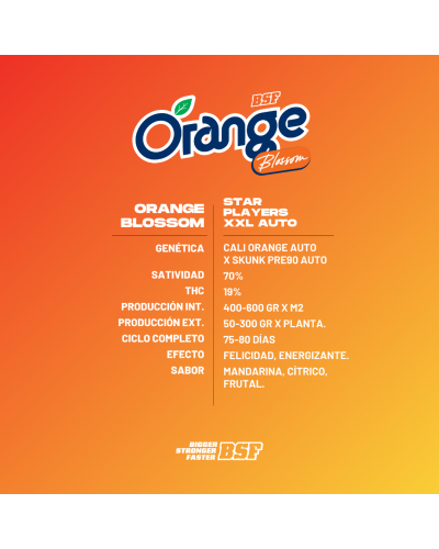 BSF Seeds presenta Orange Blossom XXL Auto. Partiendo de nuestra madre original de Orange Blossom. En los laboratorios de BSF seeds desarrollamos esta maravilla en su versión XXL Auto. La trabajamos durante cuatro generaciones con nuestra variedad autofloreciente logrando una planta de porte medio-alto, mucha producción y de fácil cuidado, sin embargo, se debe prestar atención durante la etapa inicial ya que el estrés podria congelar su desarrollo.
