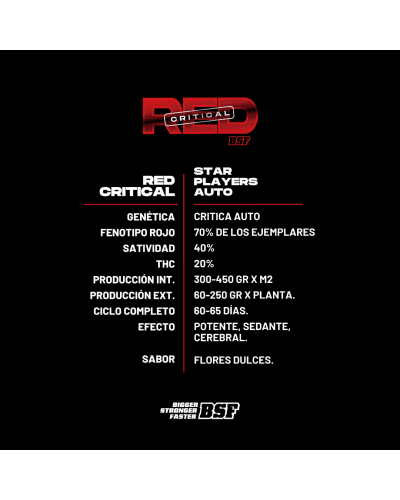 Red Critical Auto tiene fuertes tonos rojos y púrpuras que la transforman en una belleza al ojo de cualquier observador. Su estatura es media-grande, de muy fácil cuidado ya que no requiere cuidados especiales. Con grandes brazos, pesados y resinosos, volviéndose necesario utilizar tutores al final de floración. Hay que tener precaución con los niveles de humedad, ya que al ser muy compacta es el lugar perfecto para la proliferación de moho. Red Critical Auto tiene un fuerte aroma floral dulce muy agradable al paladar, que se combina a la perfección con un potente pero equilibrado subidón cerebral, que deriva en una sensación de relajación muy placentera.