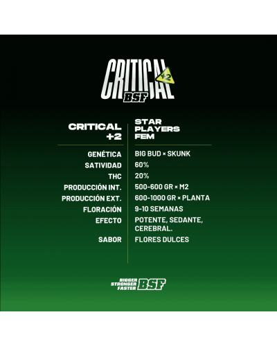 BSF Seeds presenta Critical +2 Feminized, un espectacular cruce entre Big Bud x Skunk que alcanza el olimpo del cannabis por su notable rapidez, resistencia y producción.