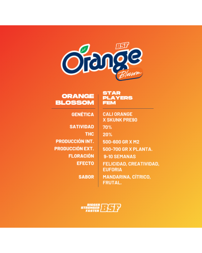 En BSF Seeds presentamos un cruce único y especial. Después de muchos años cruzando cepas para conseguir un sabor mandarina-naranja. ¡Por fin llegó Orange Blossom Feminized! Pensábamos que ya nunca iba a ver la luz. Resultado de nuestras colaboraciones con colectivos y bancos en todo el mundo conseguimos seleccionar y estabilizar aquellos ejemplares más frutales con predominancia naranja-mandarina.