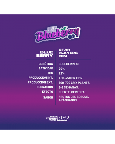 Blueberry Fem es el resultado impecable de años de selección genética. Tomada desde su fuente original (Dj Short), Blueberry Fem de BSF Seeds, se distingue por su cruza con variedades procedentes de Colombia, Panamá, México y Tailandia, lo que la hace una variedad exquisita y única en su especie.